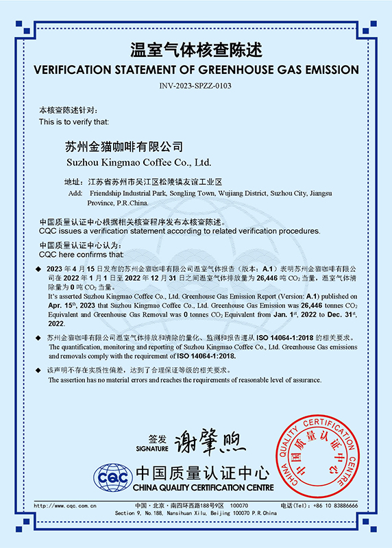 蘇州金貓咖啡有限公司雙碳證書公示